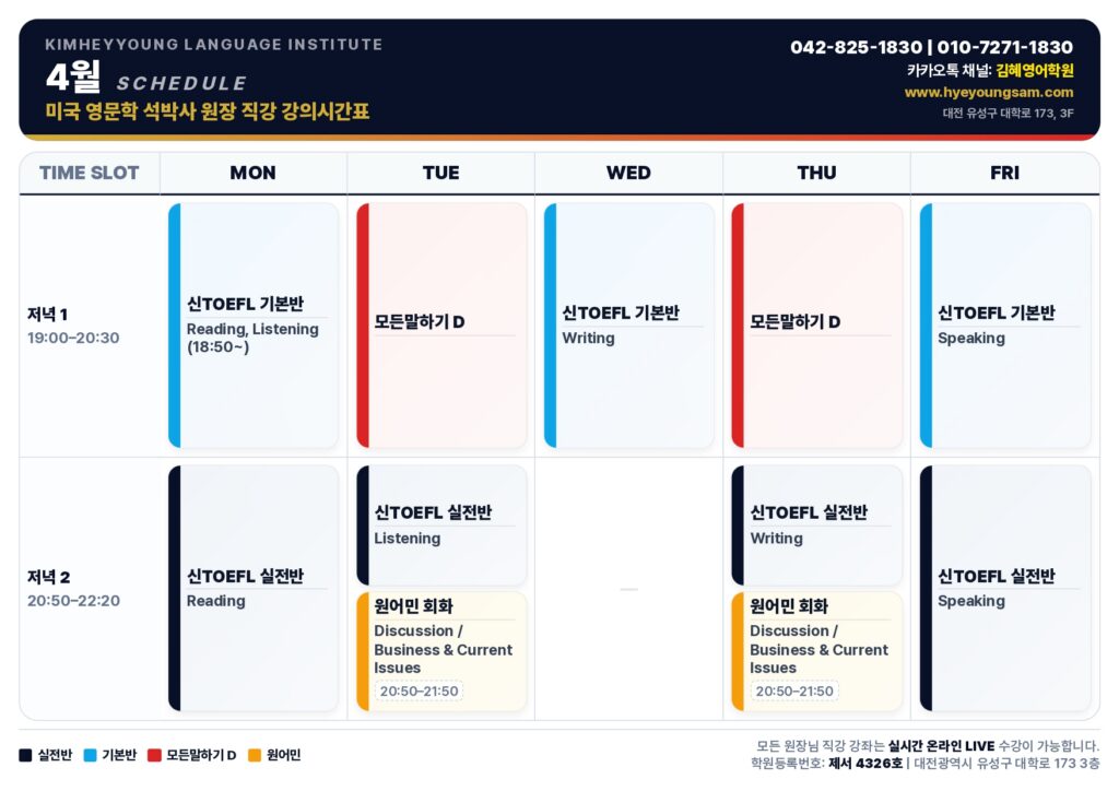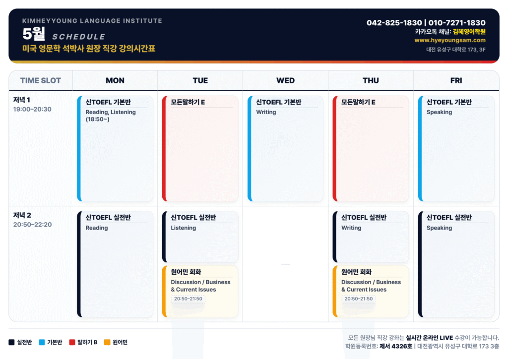 ※ TOEFL 종일반(13:00–20:30) 등 상세는 상담 시 맞춤 안내.